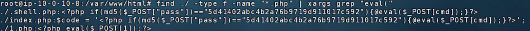 可以找到PHP恶意代码,观察前面的地址,可以找到该恶意代码的文件位置,在/var/www/html/sh.php文件中打开可以发现flag