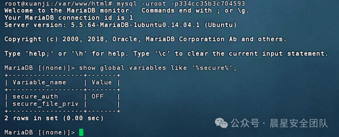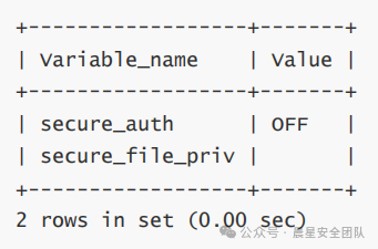 MySQL查询命令,用于显示与 “secure” 相关的全局变量及其当前设置。查看这些变量的配置,可以帮助我们了解MySQL服务器的安全性设置和限制。