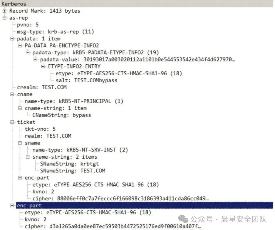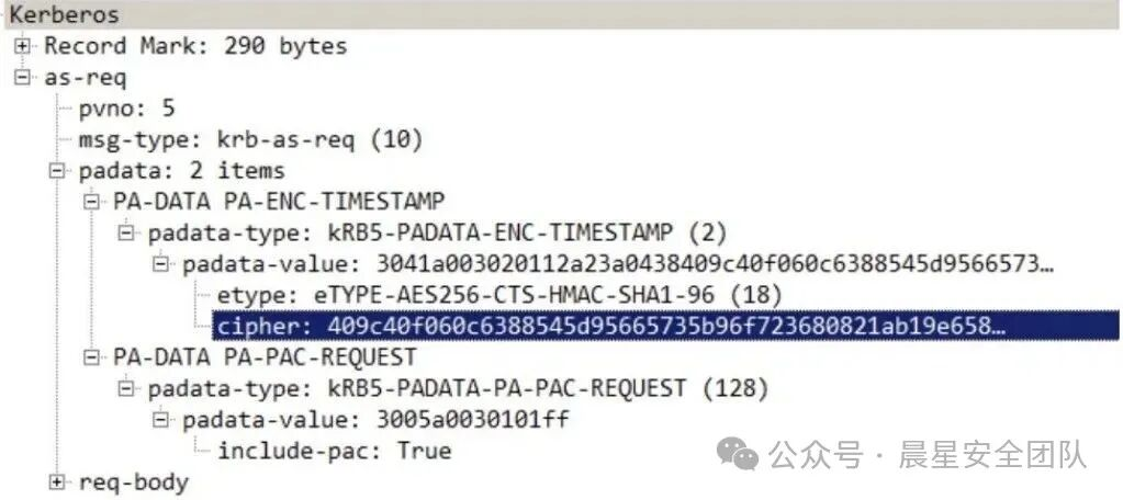 cipher 是客户端用自身密码 NTLM 哈希加密的时间戳,cname 是请求的⽤户,其存在与否会导致返回包差异,可⽤于枚举域内⽤户名。