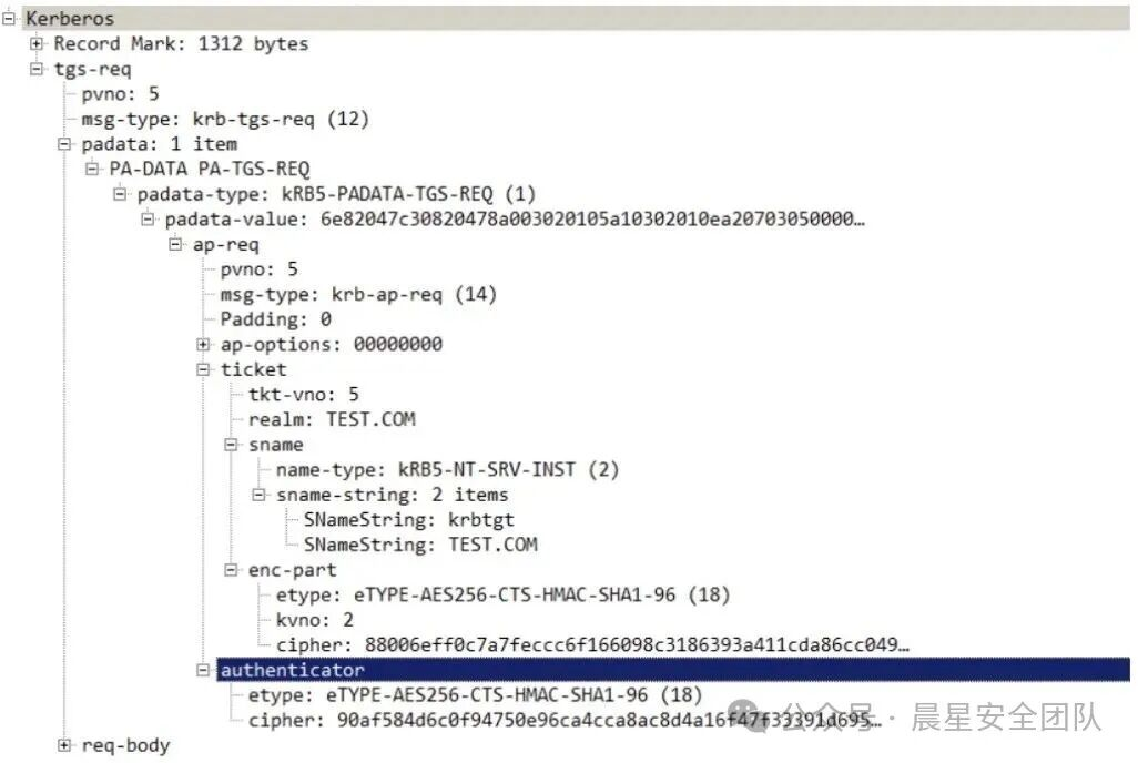 客户端用用户 hash 解密 AS_REP 中的 enc-part 获得会话密钥,将用户名/时间戳进行加密,⽣成 authenticator 和 TGT 发送给 TGS。