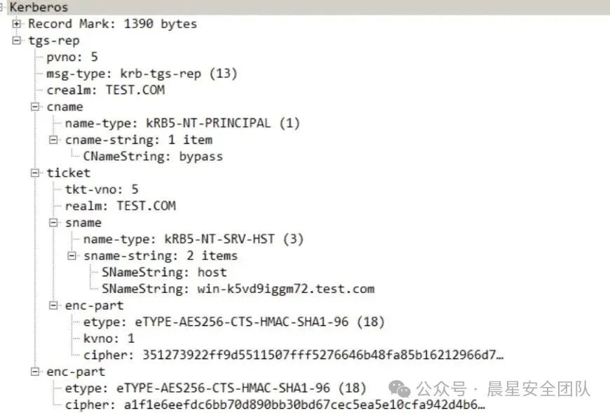 enc-part:使⽤⽤户 hash 加密,包含会话密钥/TGT 到期时间和随机数(防重放)ticket ⽤于 TGS_REQ 的认证。是加密的,⽤户不可读取里面的内容。